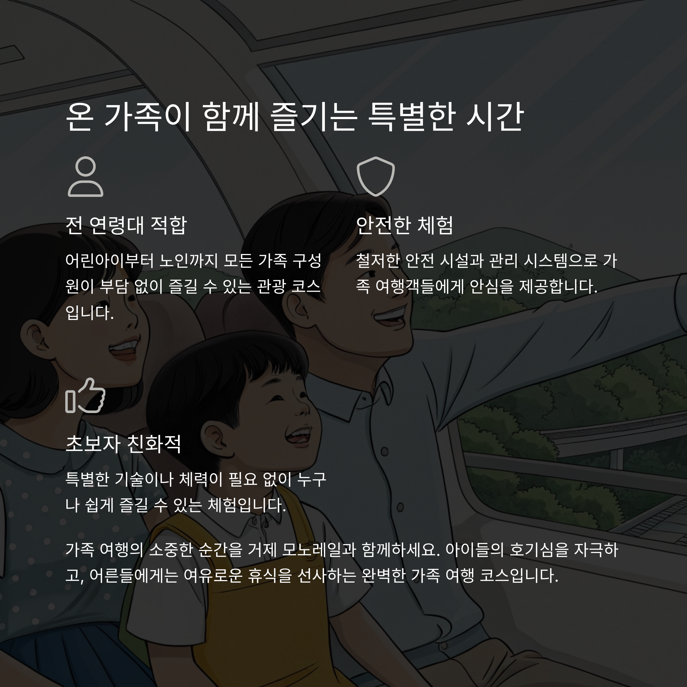거제 모노레일을 직접 타본 경험은 기대 이상이었습니다. 출발은 거제포로수용소유적공원에서 시작되며, 모노레일은 천천히 계룡산을 오르기 시작합니다. 창밖으로 보이는 풍경은 점점 더 시야가 넓어지며 바다와 산, 그리고 푸른 나무들이 어우러진 풍경을 선사합니다. 특히 가을이나 봄에는 자연의 색이 더욱 선명하게 느껴져 감동적입니다. 처음에는 느린 속도에 답답할 수 있지만, 이 느릿한 속도가 오히려 풍경을 천천히 감상하게 해줍니다. 저는 가족과 함께 방문했는데, 부모님도 아이들도 모두 편안하게 탑승할 수 있어 만족도가 높았습니다.