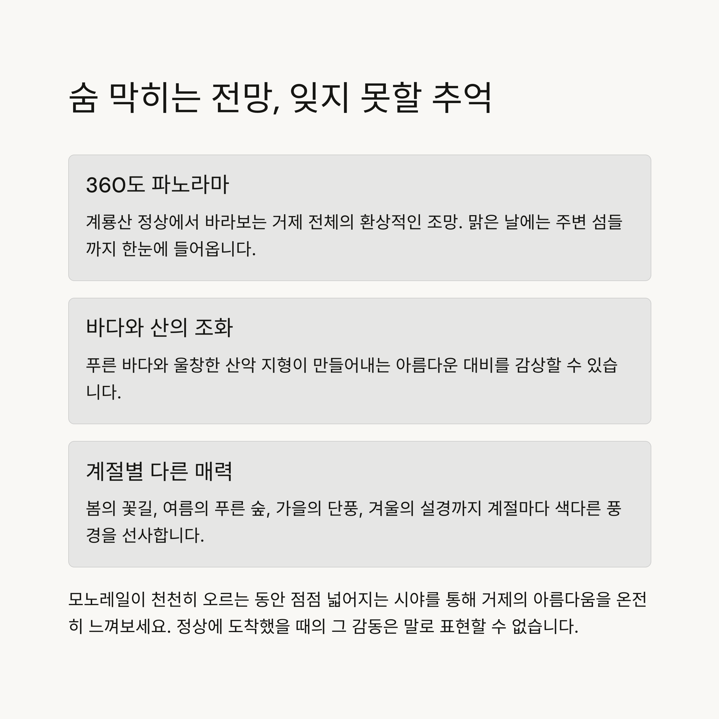 여행을 준비할 때 가장 고민되는 건 시간을 어디에 쓸지에 대한 선택입니다. 특히 가족과 함께하거나 귀한 휴가를 내서 떠나는 거제 여행이라면 더욱 신중해질 수밖에 없죠. 저는 최근 직접 거제 모노레일을 타보고 나서, 이 코스를 추천해야겠다는 확신이 생겼습니다. 물론 다양한 논란과 안전 이슈로 고민하는 분들이 많다는 것도 알고 있습니다. 그래서 오늘은 실제 체험을 바탕으로 장단점을 솔직하게 공유드리며, 여러분의 선택에 도움이 되고자 합니다. 한 걸음 한 걸음, 계룡산의 자연을 따라 올라가는 길은 여유롭고도 설렘이 가득했고, 정상에 올랐을 땐 말로 다 표현할 수 없는 전경이 펼쳐졌습니다. 모노레일의 느릿한 속도조차 그 순간만큼은 오히려 감사한 시간으로 느껴졌을 정도였죠. 이 글을 통해 여러분도 제가 느낀 감동을 함께 느껴보시길 바라며, 실제 방문 전 꼭 알아야 할 팁도 함께 소개해 드릴게요.