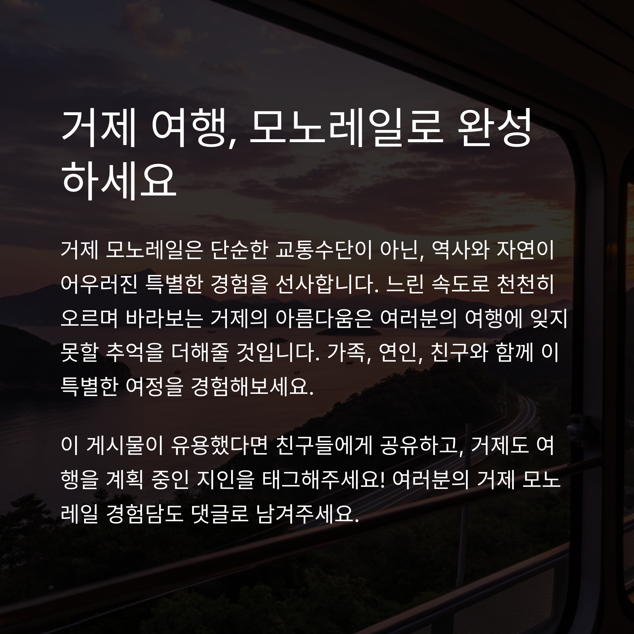 거제 모노레일을 타보신 경험이 있으신가요? 또는 이번에 방문할 계획이신가요? 여러분의 경험과 생각을 댓글로 공유해 주세요. 다양한 의견이 여행을 준비하는 다른 분들에게 큰 도움이 됩니다!