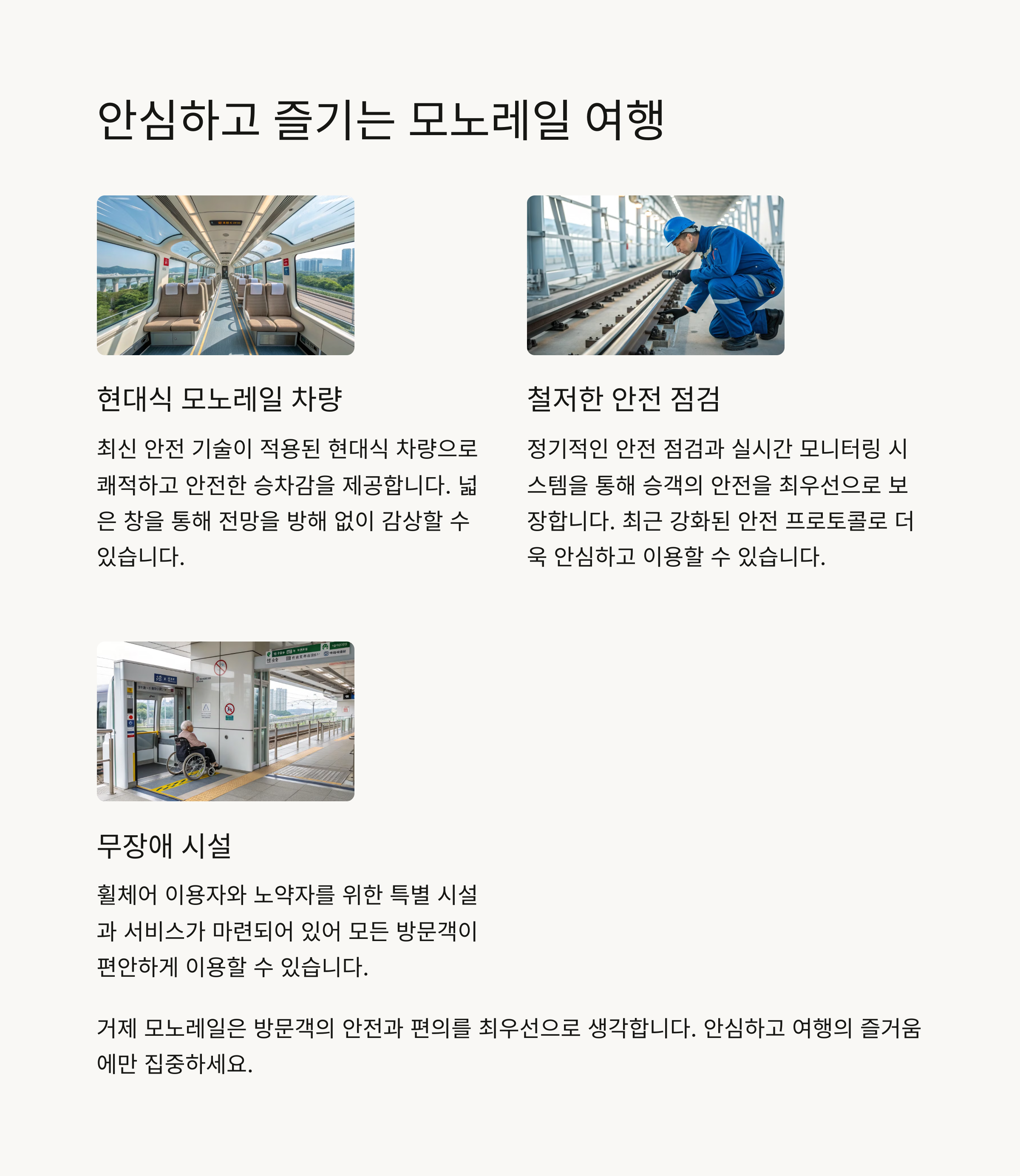 거제 모노레일은 단순한 교통수단이 아닌 체험형 관광지로 자리잡고 있습니다. 특히 전망대에 도착하면 탁 트인 뷰를 배경으로 인생샷을 찍을 수 있어 SNS 업로드용 사진을 남기기에도 훌륭합니다. 포로수용소유적공원과 연계된 역사 여행 코스로 구성하면 교육적 의미도 함께 얻을 수 있으며, 가족 단위 여행객들에게 큰 인기를 끌고 있는 이유입니다. 무엇보다 가격 대비 만족도가 높아 하루 코스로 넣기 딱 좋습니다. 예약도 간편하며, 평일에는 대기 시간도 짧아 여행의 효율성까지 높일 수 있습니다.